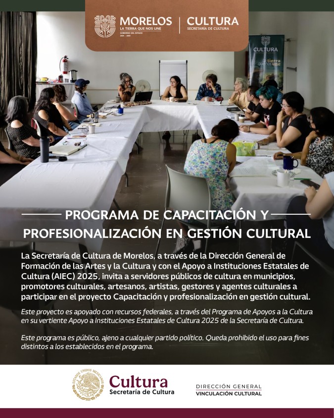 Al respecto, Montserrat Orellana Colmenares, secretaria de Cultura de Morelos, destacó: “Este proyecto busca dotar de herramientas a quienes hacen cultura en el territorio, porque la profesionalización de nuestras comunidades culturales es clave para garantizar que la cultura siga siendo un derecho humano y un motor de transformación social”.
