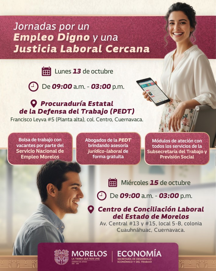 Las jornadas se realizarán de forma permanente los lunes y miércoles, de 9:00 a 15:00 horas, inician el 13 de octubre en las instalaciones de la PEDT ubicadas en calle Francisco Leyva número 5, en el Centro de Cuernavaca. Asimismo, el Servicio Nacional de Empleo (SNE) Morelos participará con vacantes incluyentes y pleno respeto a la legalidad laboral.