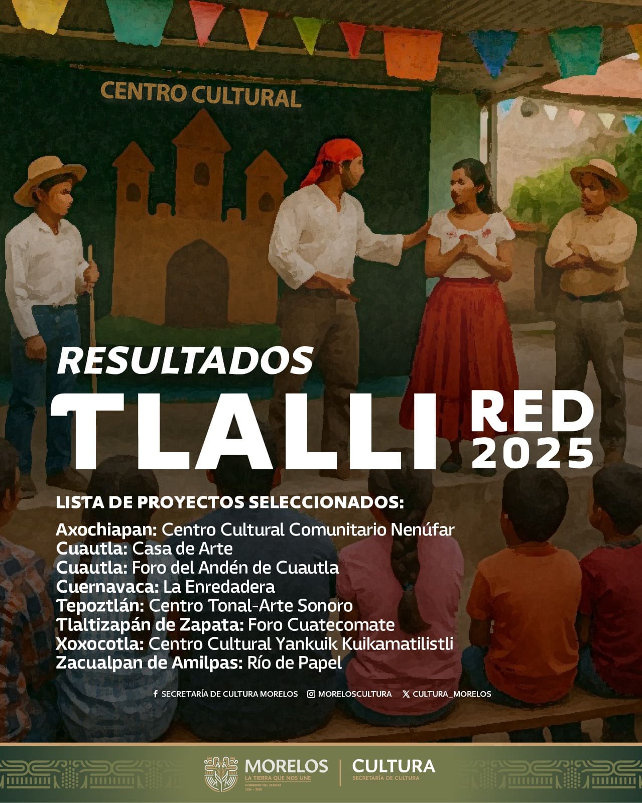 El Gobierno de Morelos, a través de la Secretaría de Cultura, dio a conocer los resultados de la convocatoria Tlalli, Red de Espacios Culturales Independientes 2025, con la que se impulsa el trabajo de colectivos y gestores que realizan actividades artísticas, culturales y comunitarias de manera autogestiva o sin fines de lucro.