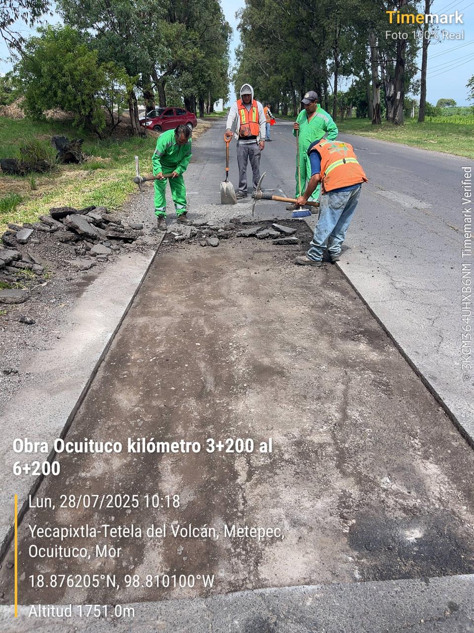 Se realizará la Conservación rutinaria en tramos aislados de la carretera Yecapixtla-Ocuituco perteneciente a las vialidades secundarias del Circuito Tierra y Libertad, mismas que cuentan con recursos autorizado de procedencia 2025 - INGRESOS PROPIOS y una fuente de Financiamiento de RECURSOS FISCALES para dicho tramo se realizaran los siguientes trabajos: Preliminares: Trazo y nivelación para vialidad con equipo de topografia 30,000.00m2, Suministro y colocación de letrero informativo de obra 2.00pza, Pavimentos: Bacheo superficial por unidad de obra terminada con mezcla asfáltica 480.00m2, Bacheo profundo en zonas aisladas 96.00m3, Barrido por unidad de obra terminada de la capa de base 30,000.00m2, Riego de liga a base de emulsión asfáltica 30,000.00lts, Construcción de carpeta de concreto asfáltico en caliente 900.00m3, Señalamientos: Señalamiento horizontal a base de una raya continúa o discontinua 9,000.00m, Suministro y colocación de vialetas reflejantes 600.00pza, Suministro y colocación por unidad de obra terminada de señales informativas de destino 2.00pza, Suministro y colocación por unidad de obra terminada de señales informativas de destino turistico 2.00pza, Suministro y colocación por unidad de obra terminada de señales preventivas 6.00pza, Suministro y colocación por unidad de obra terminada de señales restrictivas 6pzas.