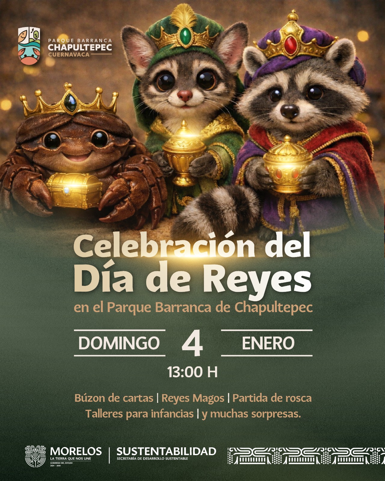 La Secretaría de Desarrollo Sustentable del Gobierno del Estado de Morelos invita a las familias morelenses a celebrar el Día de Reyes en el Parque Estatal Urbano Barranca de Chapultepec, este domingo cuatro de enero, a partir de las 13:00 horas en la entrada principal, el acceso al parque será gratuito después de las 10:00 horas.