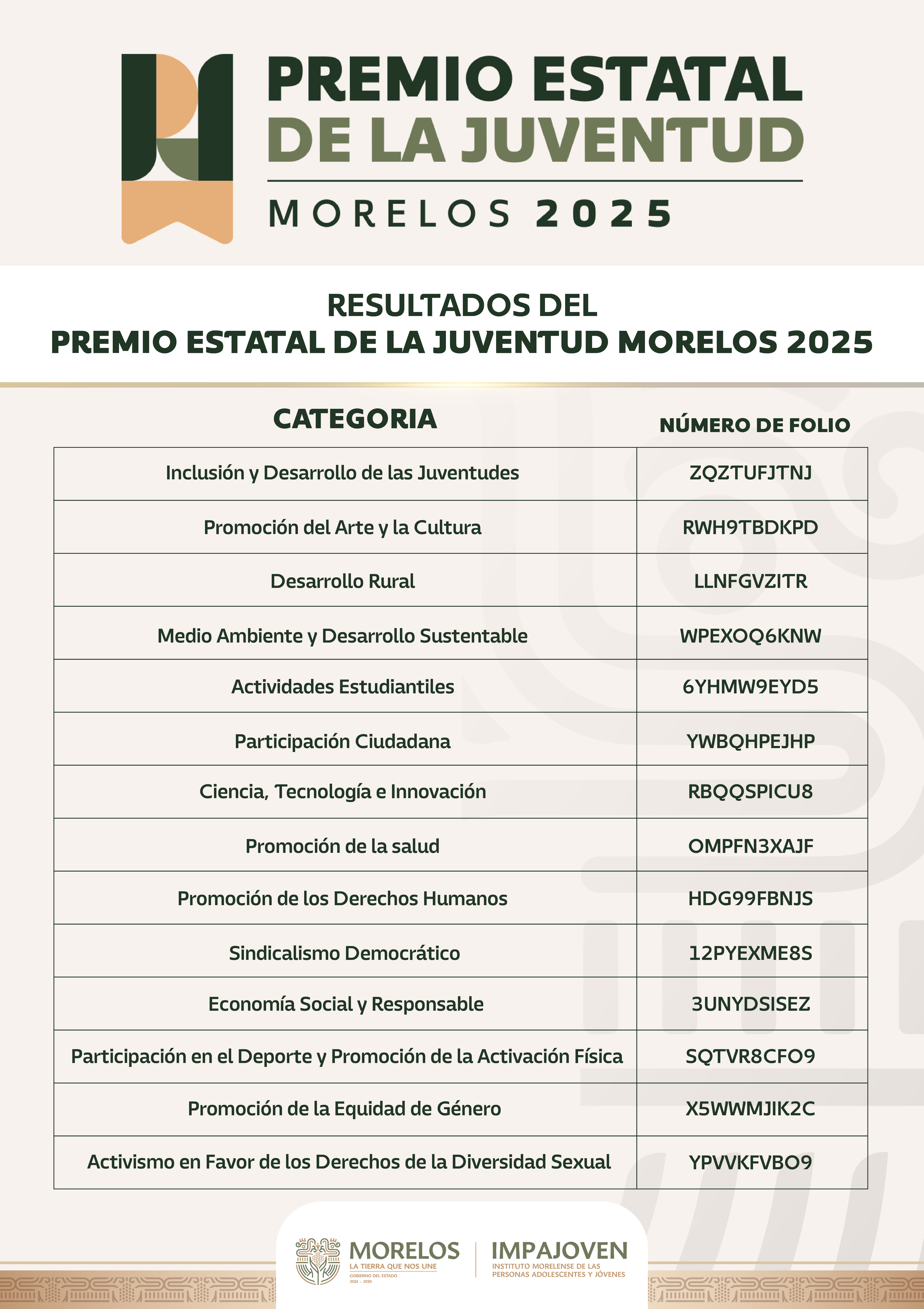 En cumplimiento de las reglas de operación, los resultados se publican mediante folios correspondientes a cada categoría evaluada. En este sentido, los folios ganadores son: Inclusión y Desarrollo de las Juventudes (ZQZTUFJTNJ); Promoción del Arte y la Cultura (RWH9TBDKPD); Desarrollo Rural (LLNFGVZITR); Medio Ambiente y Desarrollo Sustentable (WPEXOQ6KNW).